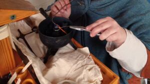 Nurkkamestari valmistaa koruja ja kertoo keskiaikaisesta kultasepäntyöstä.